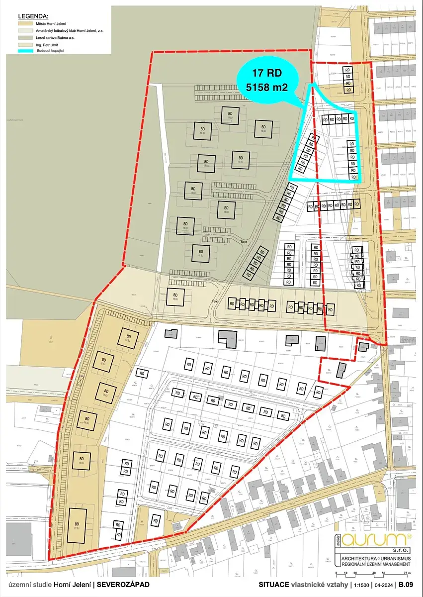 Město proto zpracovalo územní studii pro lokalitu Horní Jelení – severozápad, která je určena k výstavbě řadových a bytových domů. Náš pozemek je jedním z klíčových pozemků určených právě pro výstavbu řadových domů.