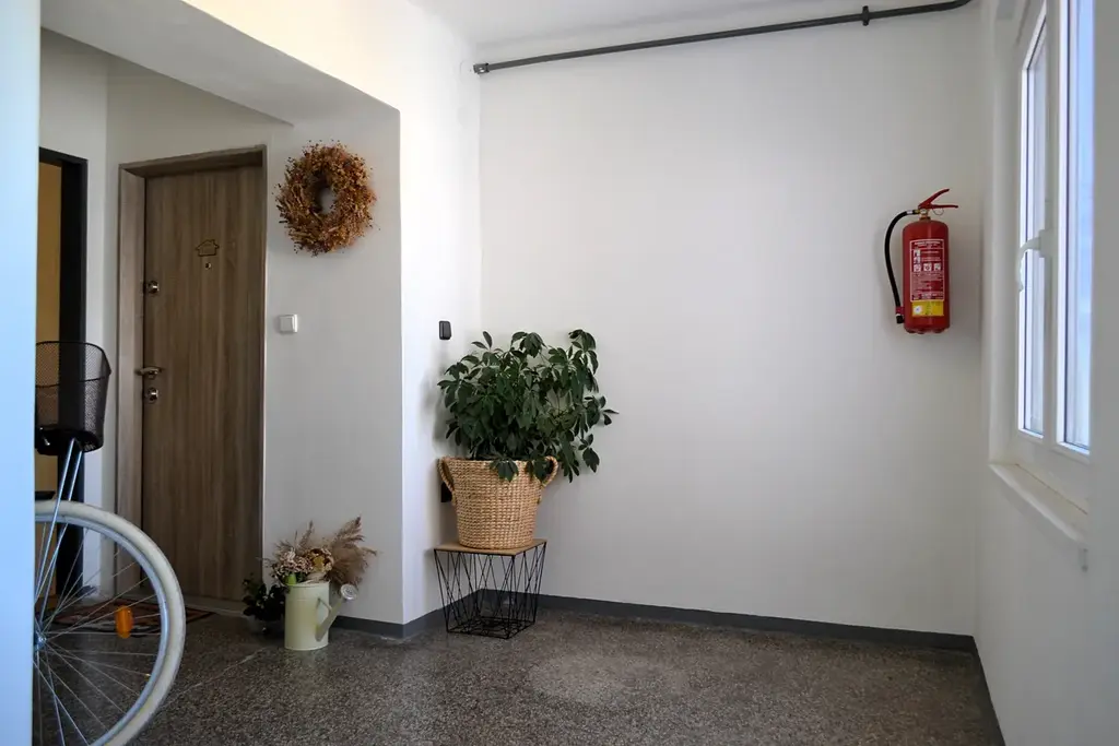 Je situován ve 2. patře historického domu s orientací oken do tří světových stran – jihozápad (ložnice a obývací pokoj), jihovýchod (pokoj) a sever (vstupní chodba a kuchyně). Nemovitost prošla postupnou citlivou renovací od podlahových krytin, štuků stěn, elektroinstalace, topného systému až po nově instalovanou kuchyňskou linku s kvalitními spotřebiči, vyrobenou na míru. Koupelna vybavena vanou, toaleta je samostatně. Podlahy kvalitní vinilové, instalace v r. 2023.