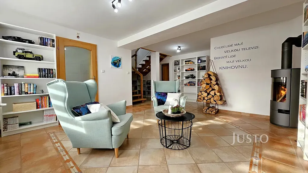 Hned po vstupu do domu vás okouzlí vzdušnost a kreativita interiéru. V přízemí na vás čeká relaxační hala (současní majitelé z ní udělali knihovnu s krbovými kamny –- ideální místo pro útěk před každodenními starostmi). Je tu také místnost se šatnou, která momentálně slouží jako domácí kino – ano, vlastní kino! A technika v domě zůstane, takže si můžete pustit film i bez vybalování krabic. Z místnosti je přímý vstup na terasu a zahradu s bazénem, který už sice nějakou dobu neviděl plavky, ale i tak je to luxusní prvek na zahradní párty.