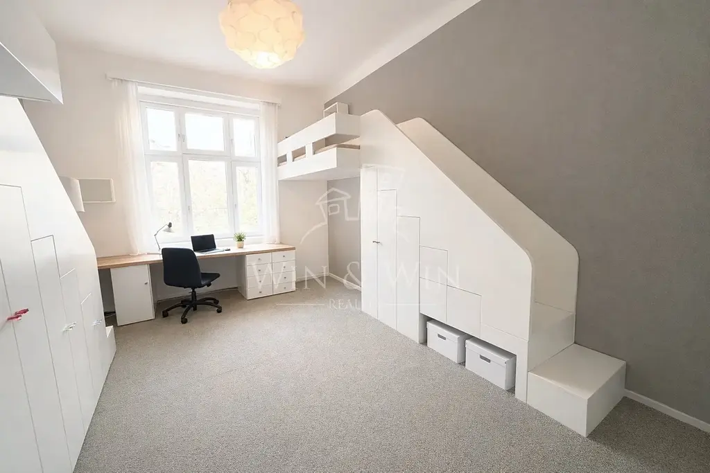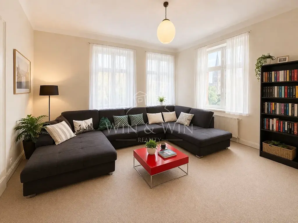 Prostorný byt o rozměrech 120 m² s vysokými stropy a vzdušným pocitem se nachází v přízemí činžovního domu. Velkorysé, světlé pokoje a promyšlené úložné prostory díky vestavěným skříním. Ideální pro rodinu i komfortní bydlení s elegancí a praktičností.