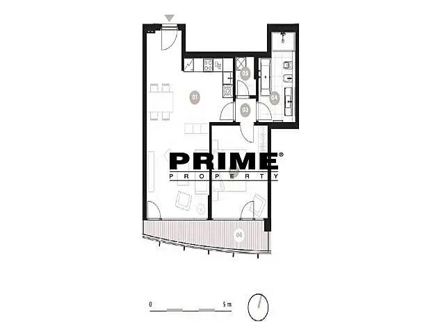 Fotografie bytu jsou ilustrativní z podobného bytu v budově. Dispozice bytu: vstupní předsíň, obývací pokoj (29m2) s jídelní částí a s otevřenou, plně vybavenou italskou kuchyní se spotřebiči (indukční varná deska, elektrická trouba, lednice s mrazákem, myčka a mikrovlnná trouba), nádobím a kuchyňským náčiním a vstupem na terasu (19m2), ložnice (16m2) se vstupem na terasu, koupelna (vana, sprchový kout, umyvadlo, toaleta, bidet) a samostatné WC. Dřevěné podlahy a velkoformátová dlažba. Rekuperace vzduchu, podlahové topení, internet, videotelefon, alarm.