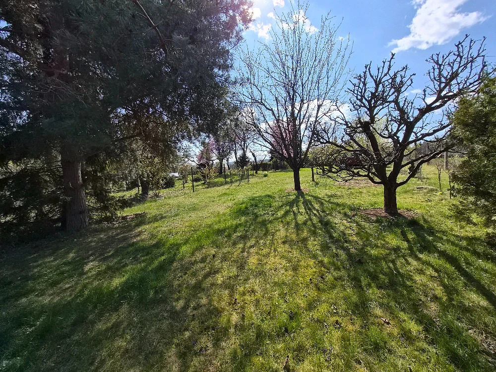 Zahrada je osázena vzrostlými ovocnými stromy, třešní, meruňkou, švestkou a jabloněmi. Dešťová voda je zachytávána do tří nádrží, což umožňuje její praktické využití pro zalévání.