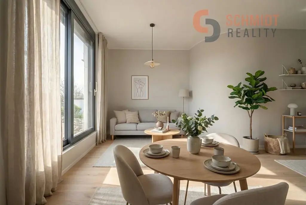 Předmětem prodeje je byt bez vyobrazeného nábytku; vizualizace znázorňují možné budoucí uspořádání interiéru.