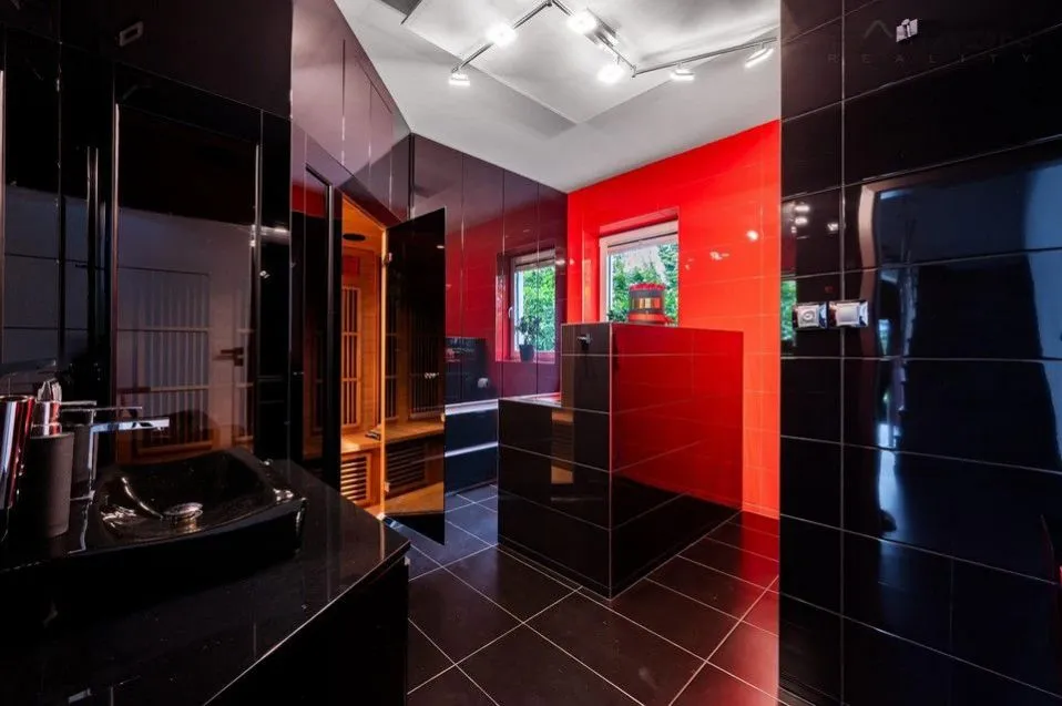 Vytápění domu zajišťuje moderní tepelné čerpadlo a plynový kotel s podlahovým vytápěním v přízemí. Okna jsou plastová s hliníkovými rámy a elektrickými žaluziemi. Vila nabízí tři prostorné vestavěné šatny a dvě koupelny vybavené luxusními prvky, včetně sauny, hydromasážní vany a vyhřívací lavice ve sprše. Exteriér doplňuje zastřešený a vyhřívaný bazén a dětský domek o velikosti cca 25 m. Dům je napojen na městský vodovod a kanalizaci.