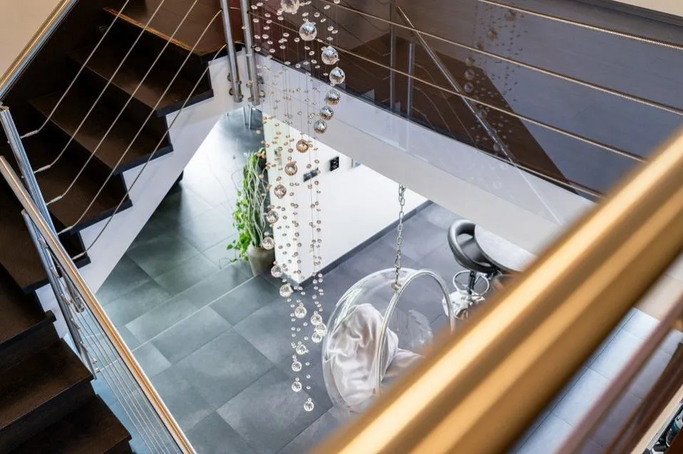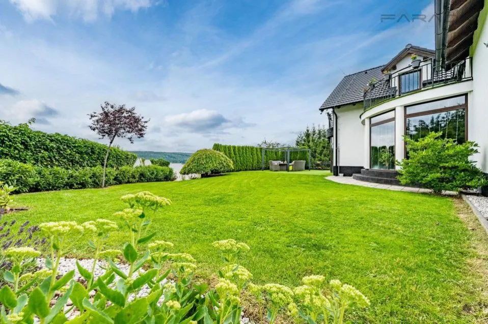Vila zahrnuje dvě nadzemní podlaží a půdní prostor a nabízí sedm pokojů s kuchyní plus pracovnu. K dispozici jsou prostorné terasy a balkón poskytující příjemné venkovní posezení s krásným výhledem. Součástí nemovitosti je garáž a další parkovací místa na pozemku.