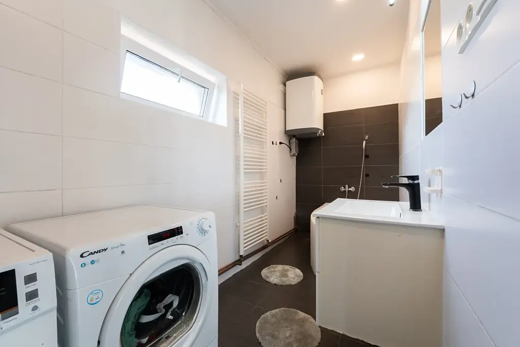 Vytápění je řešeno krbem s výměníkem a rozvodem do radiátorů, s možností kombinace s elektrokotlem. Ohřev vody zajišťují dva samostatné bojlery. Dům je napojen na veřejný vodovod, odpady jsou řešeny kombinací kanalizace a jímky
