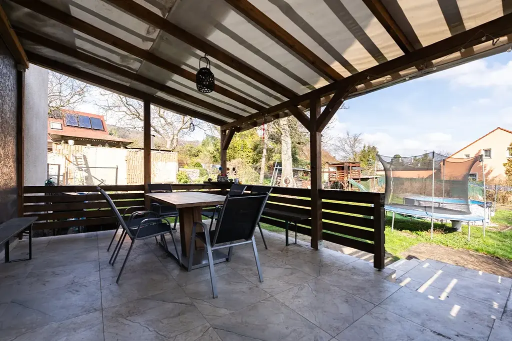Z domu je přímý vstup na zahradu skrze venkovní terasu 24 m². Zahrada o výměře 700 m² poskytuje plnohodnotný prostor pro rodinné využití, parkování, zázemí i další úpravy.