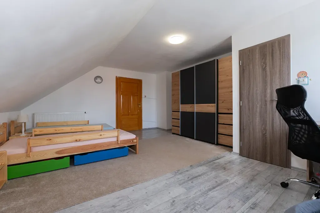 Ve 2. nadzemním podlaží jsou dva pokoje propojené koupelnou, chodba a další prostor podél celé jedné strany domu, aktuálně využívaný pro uskladnění věcí, s možností úpravy dle vlastních potřeb.