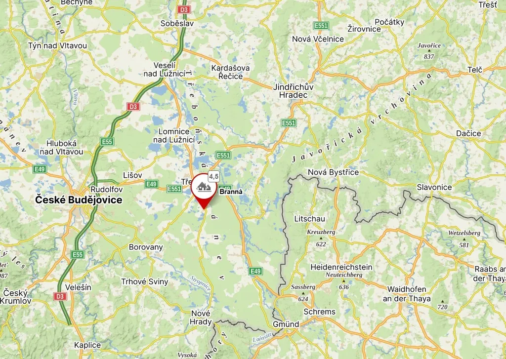 Obec Branná, patřící pod město Třeboň, se nachází asi 5 km jižně od centra Třeboně směrem na Nové Hrady v chráněné krajinné oblasti Třeboňsko.