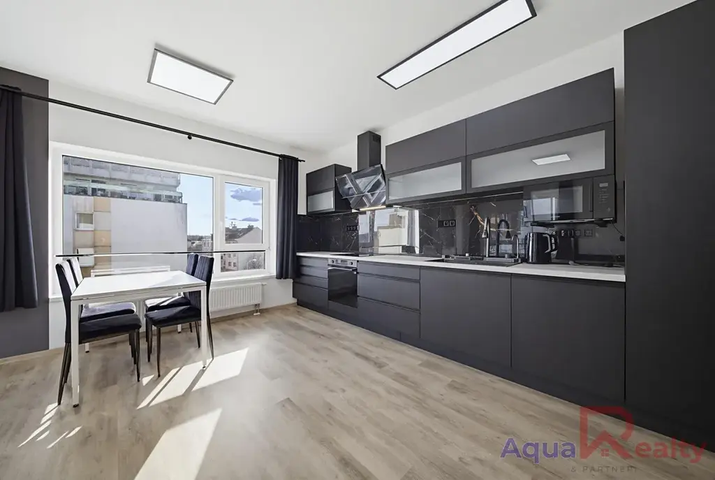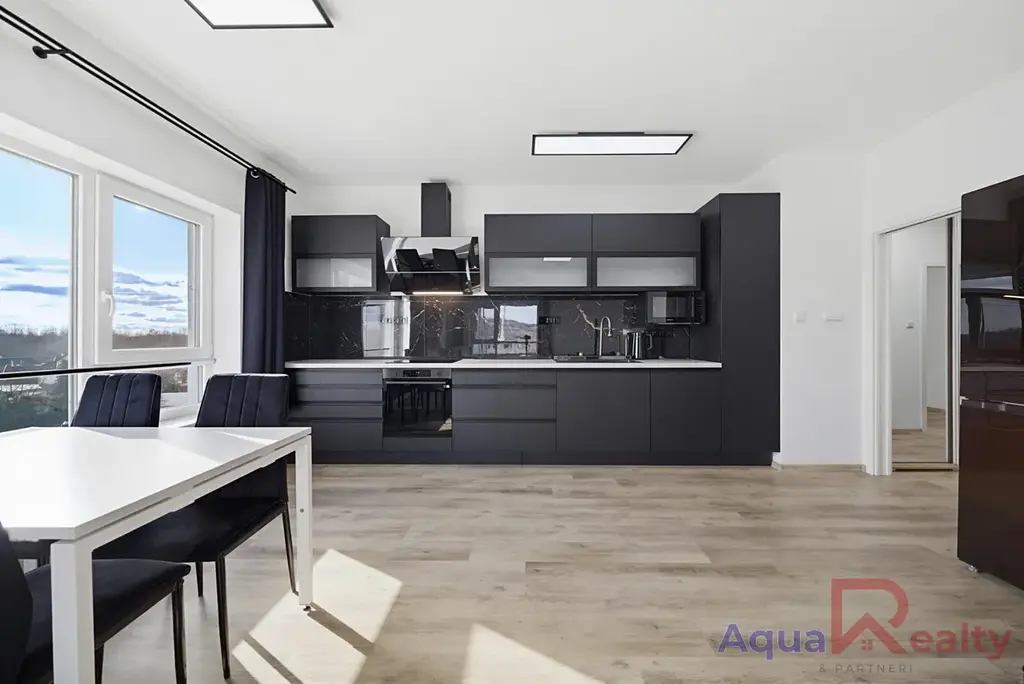 Interiér bytu působí velmi vzdušně a čistě. Dominantou je prostorný obývací pokoj propojený s moderní kuchyňskou linkou v elegantním tmavém designu, která je plně vybavena spotřebiči, včetně myčky, trouby s indukční deskou, mikrovlnné trouby a dvoukřídlé lednice. Obývací část je doplněna o sedací soupravu, konferenční stolek a jídelní kout se stolem a židlemi. Velká okna zajišťují dostatek denního světla a příjemnou atmosféru.
