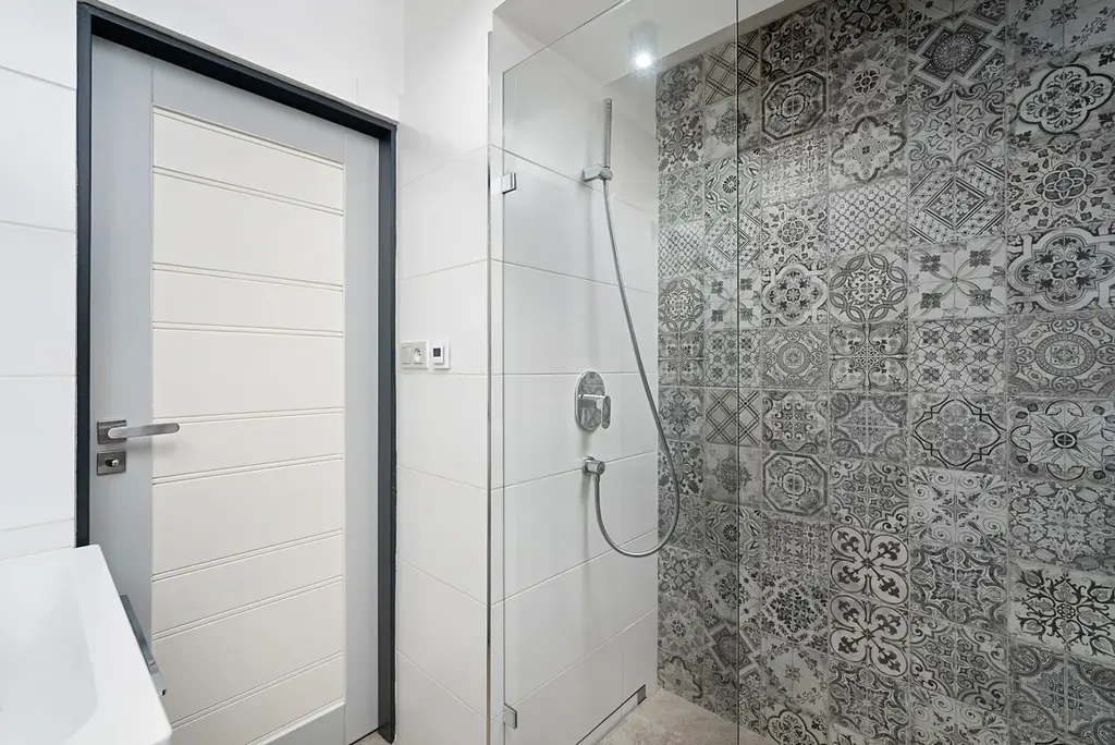 -koupelna se sprchovým koutem typu walk-in, toaletou a podlahovým vytápěním