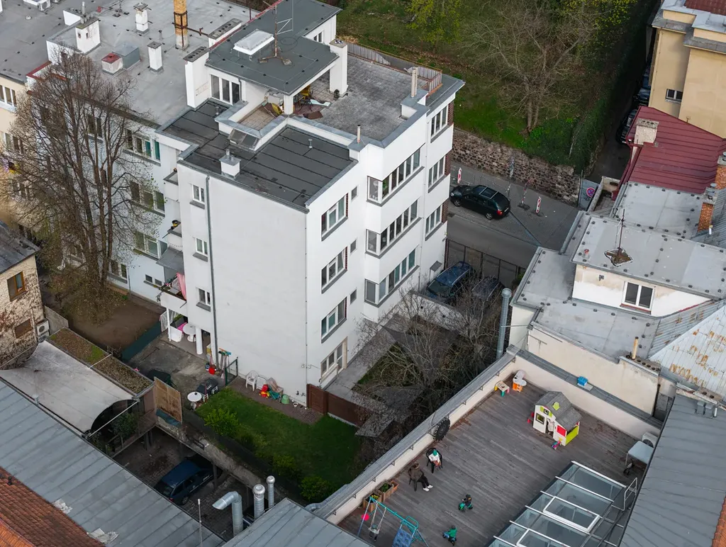 Byt je situován v přízemí menšího cihlového domu a je orientovaný výhradně do vnitrobloku. Díky tomu si zachovává klid a soukromí. Hlavní obytný prostor plynule navazuje na zahradu, která se stává jeho přirozeným pokračováním. Právě tato vazba mezi interiérem a exteriérem zásadně mění způsob, jakým člověk vnímá každodennost žití v centru města.