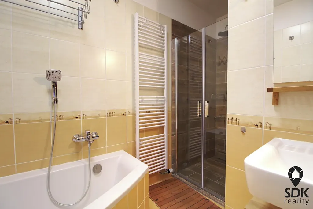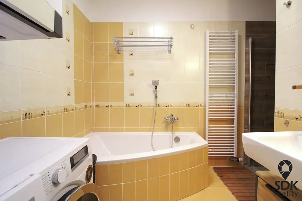 Koupelna je vybavena vanou i sprchovým koutem. Vytápění zajišťuje plynový průtokový kotel se zásobníkem na 50 litrů.