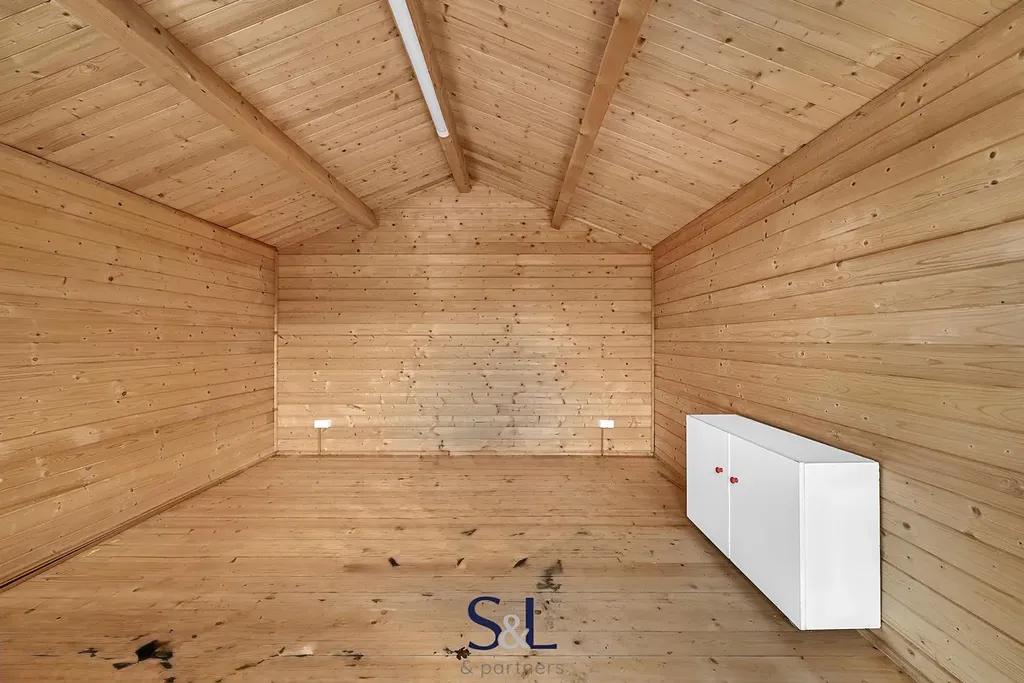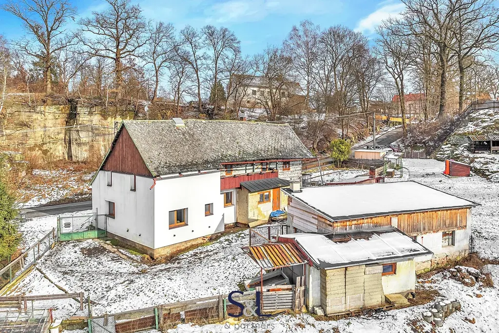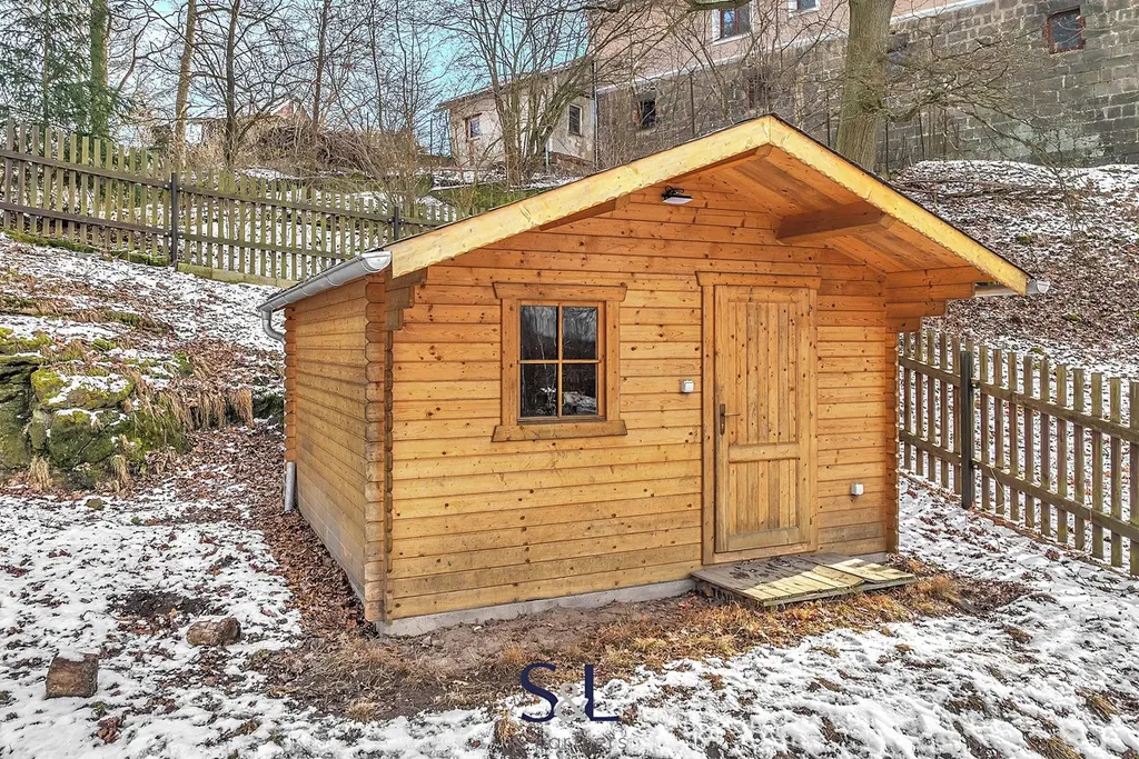 Součástí nemovitosti je oplocený pozemek o výměře 2 415 m². Najdete zde garáž s dílnou, skleník, stylový dřevěný domek pro děti i dospělé, studnu a také sklep vytesaný ve skále.