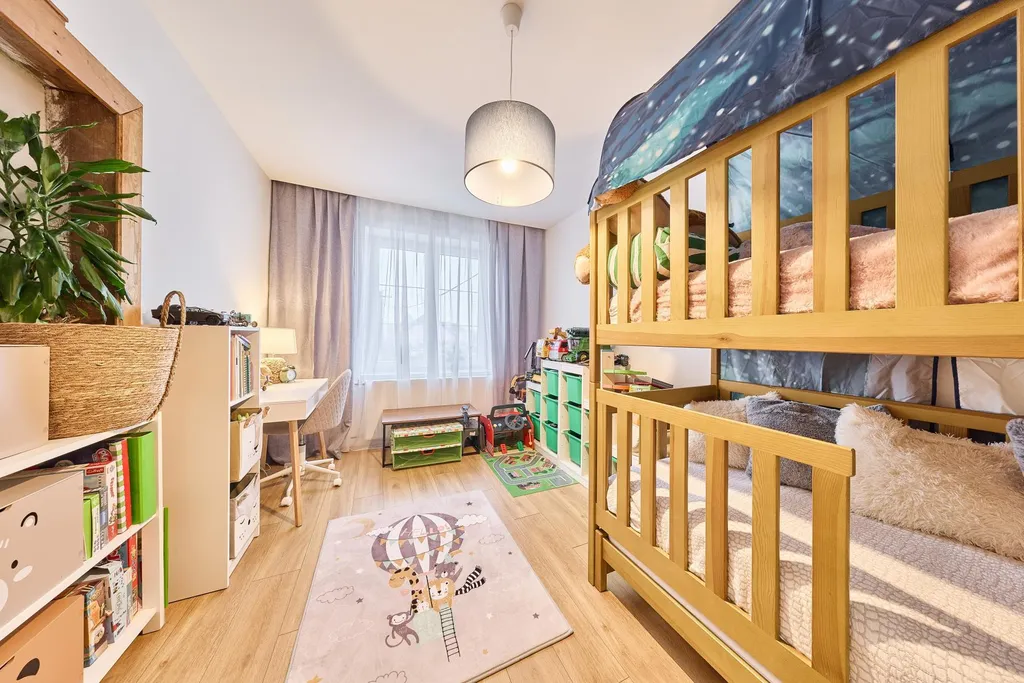 Obytná část má výměru 110 m2. Dispozice: přízemí domu - obývací pokoj s kuchyní, ložnice, koupelna se sprchovým koutem a toaletou, schodištěm vejdete do 2. NP, kde je chodba, koupelna s vanou a toaletou, dětský pokoj, 2. ložnice, technická místnost a šatna. Příjemná je i veranda o výměře 6 m2. Komfort zajišťují 2 koupelny a impozantní bílá luxusní kuchyně propojená s obývacím pokojem.