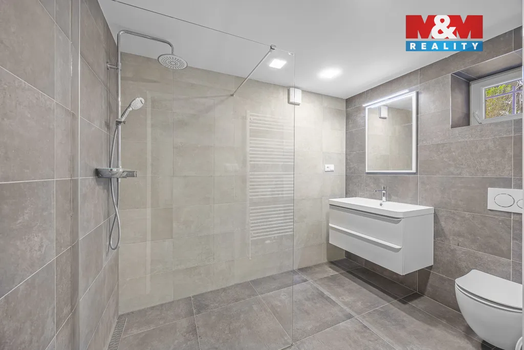 Suterén domu nabízí velmi zajímavé využití – nachází se zde pokoj s krásnou koupelnou, technická místnost, komora a garáž. Tento prostor lze využít i jako samostatnou kancelář či zázemí pro podnikání.