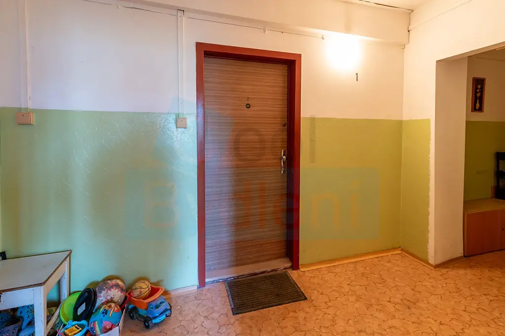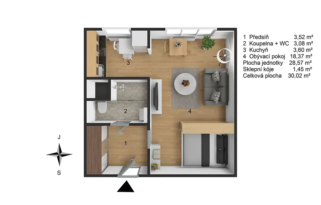 Vstup do bytu vede do předsíně (3,52 m²) s vestavěnou skříní, odkud je samostatný vstup do koupelny s toaletou (3,08 m²).