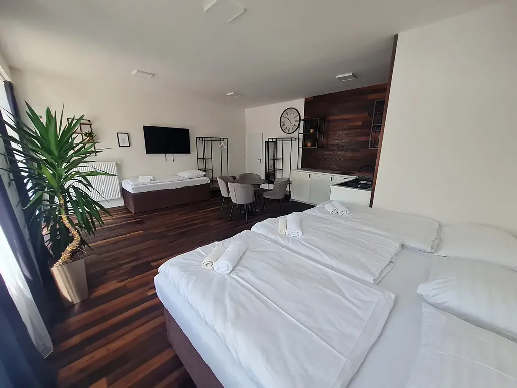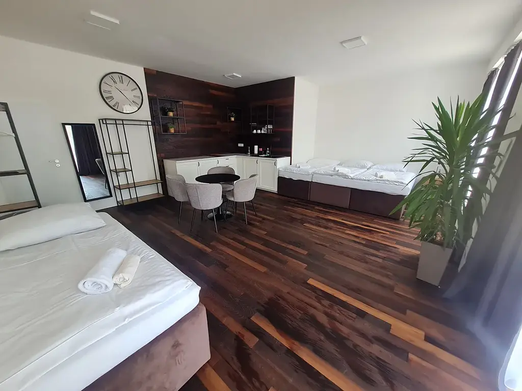 Ve 2.NP nalezneme jeden čtyřlůžkový apartmán (dvě místnosti) a dva třílůžkové