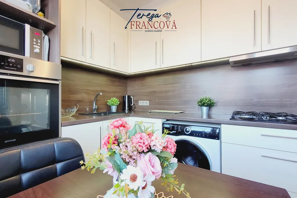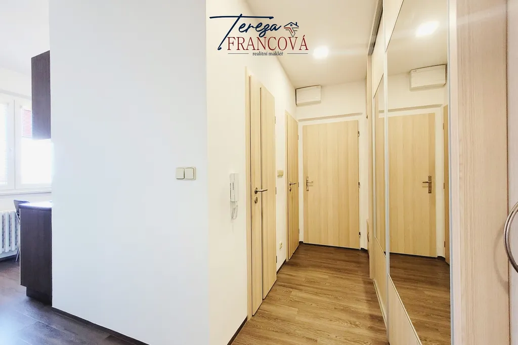 Po vstupu do bytu vás přivítá chodba s vestavěnými skříněmi, které poskytují dostatek úložného prostoru. Samostatná kuchyně je vybavená moderní kuchyňskou linkou s vestavnými spotřebiči, takže máte vše potřebné ihned k dispozici.