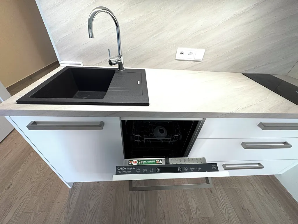 • Kuchyňská linka se vestavěnými spotřebiči: lednice s mrazákem, myčka, trouba, indukční varná deska, digestoř