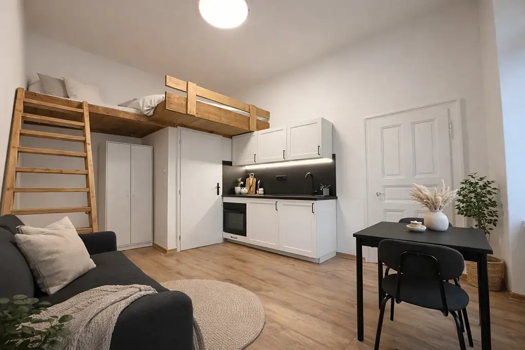 Byt je řešen jako 1+kk s důrazem na maximálně efektivní využití prostoru. Hlavní obytná místnost je propojena s moderním kuchyňským koutem vybaveným kuchyňskou linkou včetně spotřebičů. Velkou výhodou je spací patro, které odděluje zónu pro odpočinek od denní části a přispívá k lepší organizaci prostoru. Součástí bytu je koupelna se sprchovým koutem a toaletou. V bytě se dále nachází technická místnost, ve které je umístěna pračka. Interiér působí čistě, moderně a vzdušně.