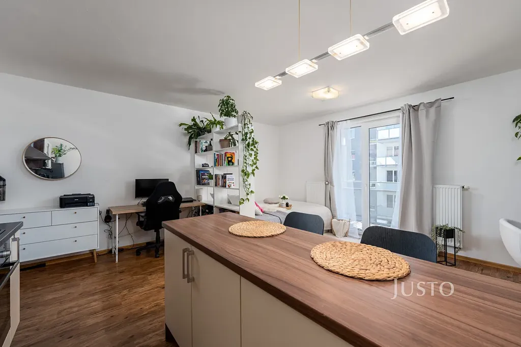 Hlavní obytná místnost s vinylovou podlahovou krytinou je propojená s kuchyňským koutem a využívá každý centimetr na maximum. Kuchyně s ostrůvkem, spací část, pracovní kout a home-office na slunném balkóně. Moderní kuchyňská linka na míru poskytuje kompletní vybavení spotřebiči – indukční varná deska, horkovzdušná trouba, digestoř s odtahem, myčka, mikrovlnná trouba i lednice s mrazákem. Prostor působí velmi příjemně a nabízí dostatek místa nejen pro odpočinek, ale i pro práci z domova nebo studium.