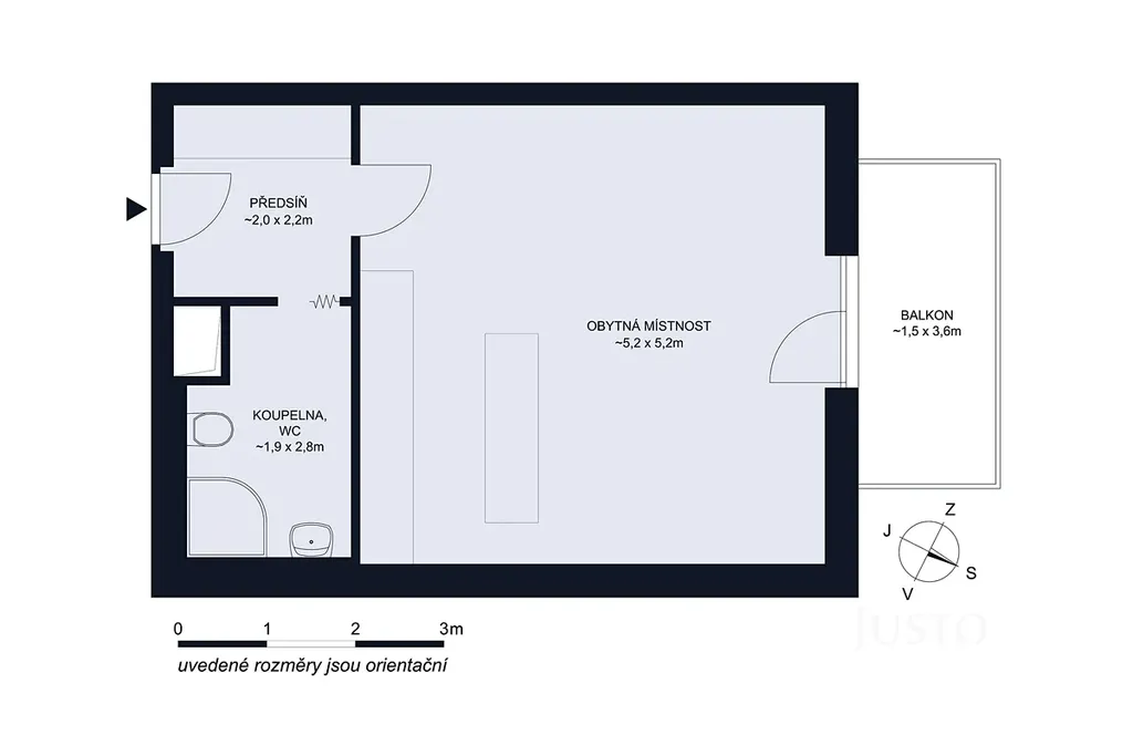 V koupelně využijete sprchový kout, toaletu, místo na pračku a topný žebřík. Úložný prostor? V předsíni je parádní vestavěná skříň, což v malometrážních bytech nebývá samozřejmostí.