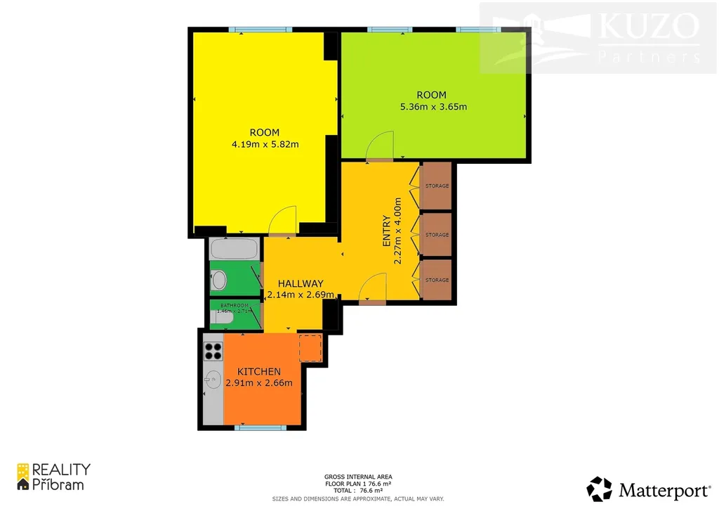 Zatímco tabulky v katastru nemovitostí uvádějí plochu 69,4 m2, realita je mnohem zajímavější. Podle přesného zaměření Matterport disponuje byt vnitřní podlahovou plochou 76,6 m2. K bytu navíc náleží zděný sklep o velikosti 4,2 m2.