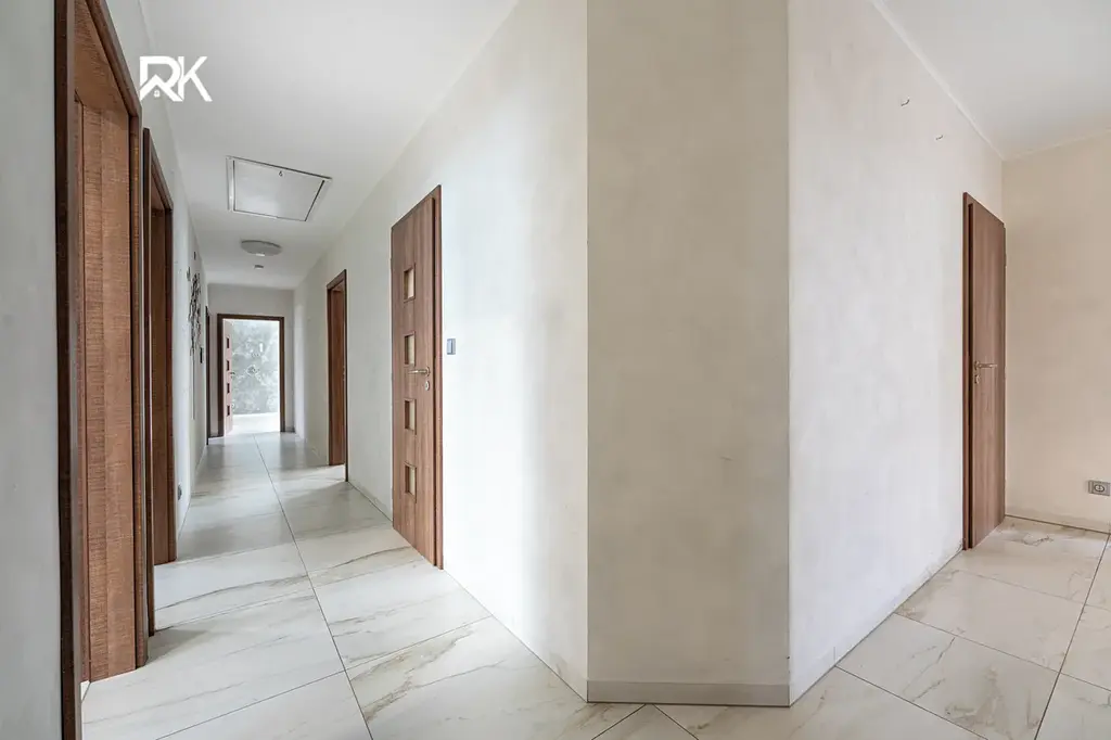 Dům je dispozičně řešen jako 5+kk. Dominantou je prostorný obývací pokoj propojený s kuchyní a jídelnou, jehož atmosféru doplňují krbová kamna.