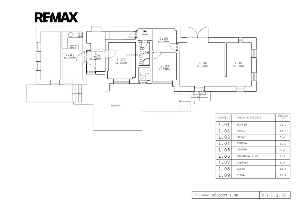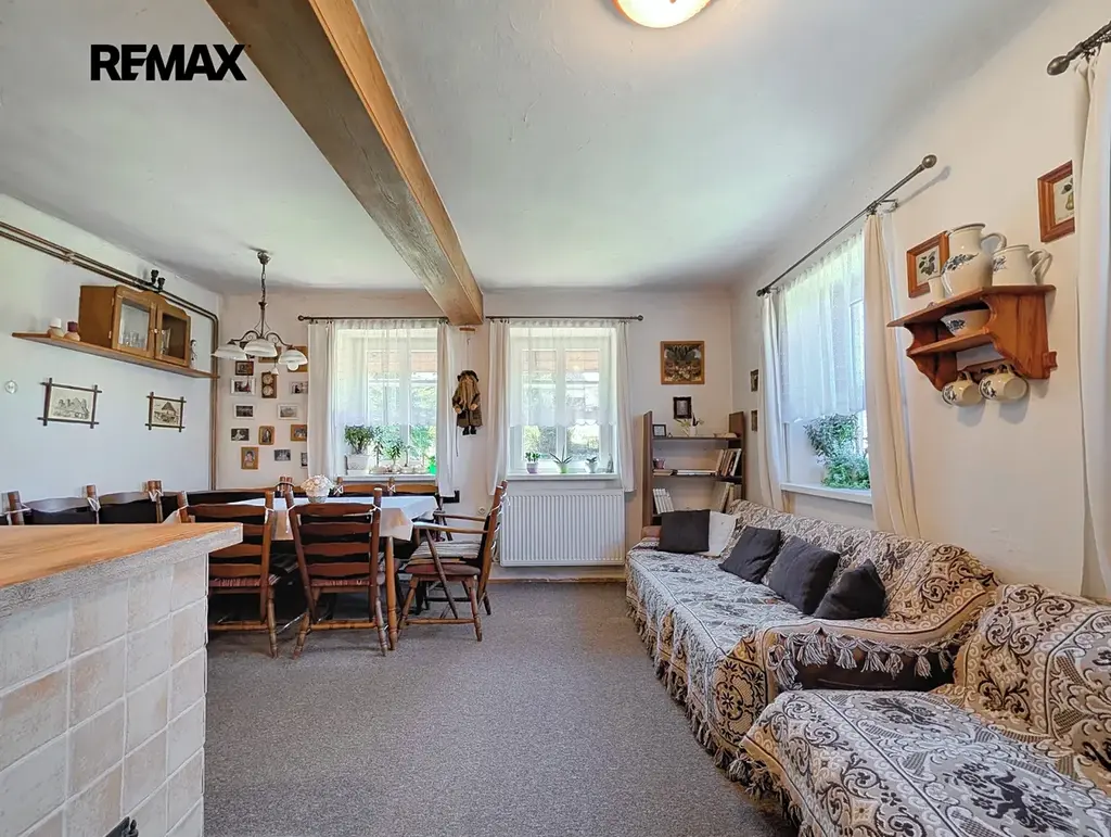 Dům o užitné ploše 93,3 m² nabízí útulnou obytnou kuchyni a dvě samostatné místnosti (58,4 m²). Na obytnou část navazuje praktické zázemí – dílna, garáž a technická místnost (34,8 m²).