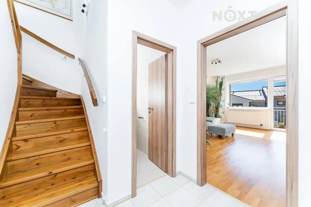 Dispozice bytu: zádveří a vstupní chodba, obývací pokoj propojen s kuchyňským koutem a výstupem na balkón, wc, po schodech do patra, kde jsou 2 samostatné pokoje, koupelna s vanou a technická místnost s možností zapojení pračky. Vytápění bytu a ohřev teplé vody zajišťuje společný plynový kotel pro každý blok.