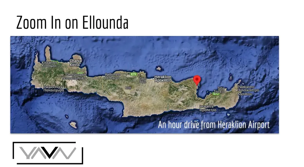 Elounda je známá svým klidným prostředím, křišťálově čistým mořem a nádhernými výhledy na záliv Mirabello. Centrum Eloundy s restauracemi, kavárnami a obchody je vzdáleno přibližně 10 minut jízdy, stejně jako oblíbené město Agios Nikolaos.