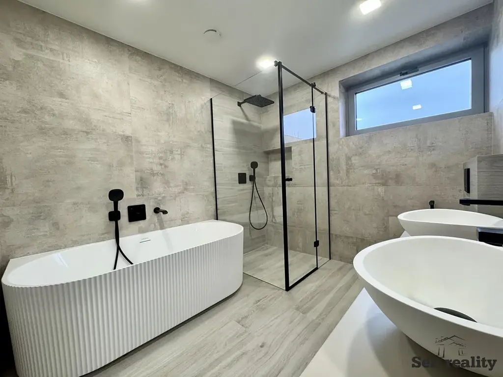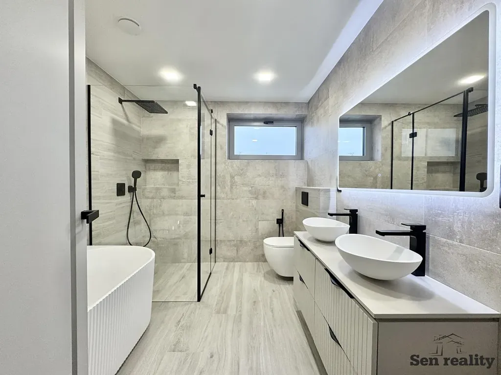 Kvalitní sanita a obklady v koupelně i na WC, baterie značky Hansgrohe