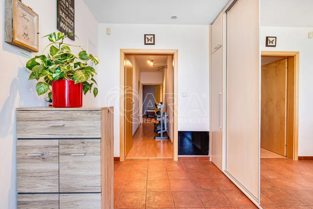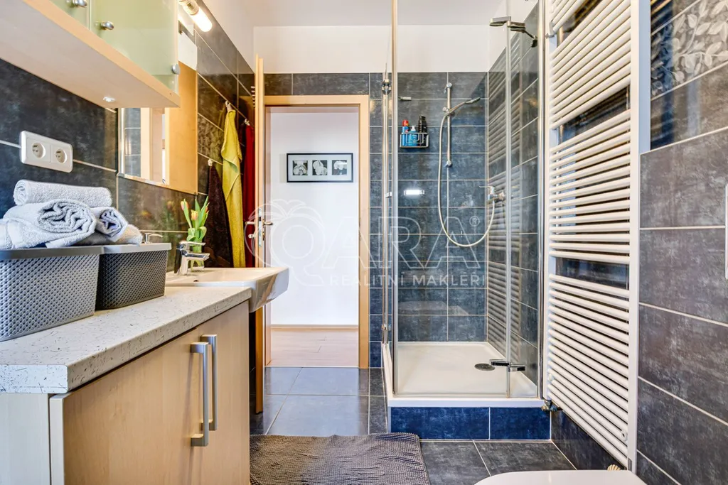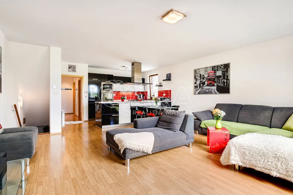 Dominantou celého domu je obývací pokoj o velikosti 42 metrů čtverečních, s úžasným výhledem do zahrady a přímým vstupem na terasu. Díky vysokému plotu si na zahrádce o velikosti 139 metrů čtverečních můžete užívat nerušeného soukromí nebo si užít pohodu s přáteli, třeba při grilování. V kuchyňské části domu najdete kompletně vybavenou kuchyňskou linku s plynovým sporákem, horkovzdušnou i mikrovlnou troubou, vestavnou lednicí s mrazákem a myčkou. Kuchyně díky své velikosti nabízí také dostatek úložných prostor.