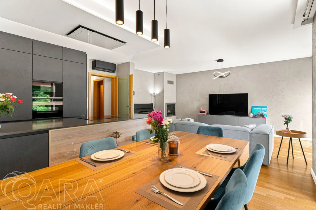 Dominantou celého domu je klimatizovaný obývací pokoj s kuchyňským koutem, o velikosti 40 metrů čtverečních, propojený francouzskými okny se zahradou a funkčním krbem. V kuchyňské části najdete novou luxusní kuchyňskou linku vybavenou prémiovými spotřebiči Siemens, včetně designového odsavače.