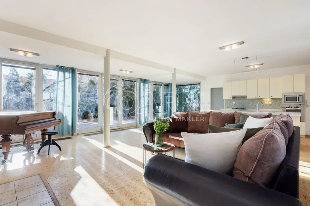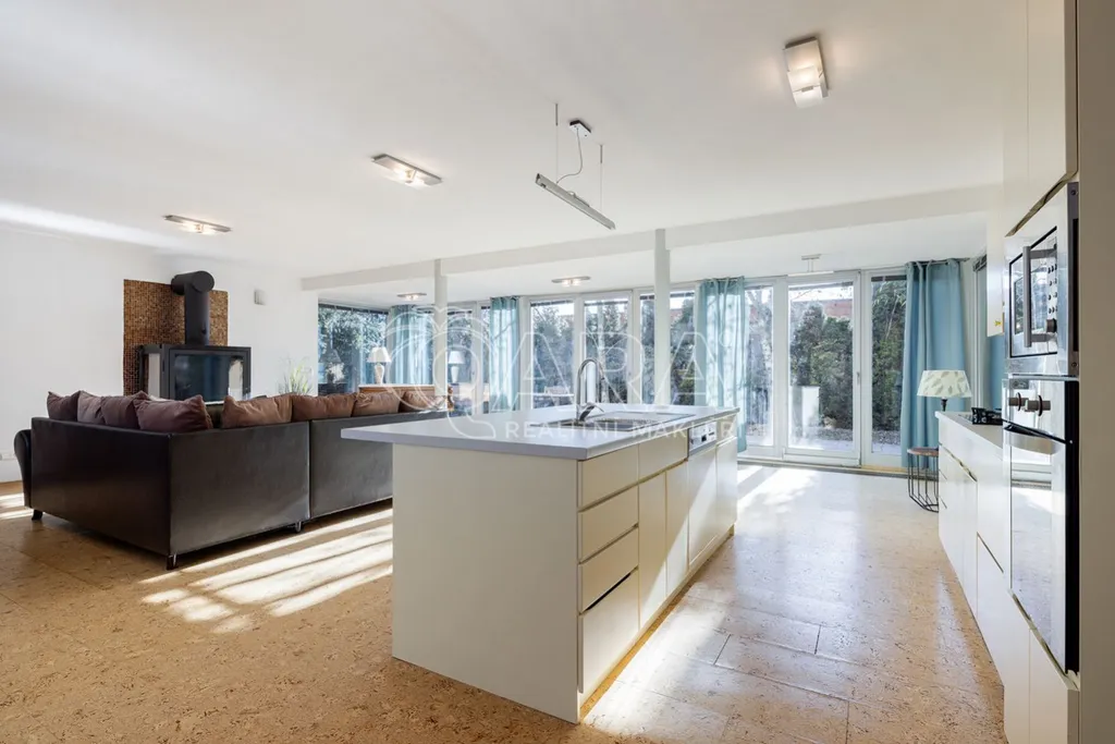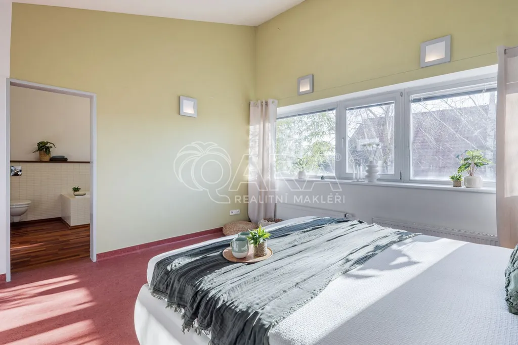 Kromě hlavního obytného prostoru s kuchyní, který se pyšní propojením okny se zahradou po celé délce stěny, najdete v přízemí ještě druhý pokoj, který může sloužit buď jako pokoj pro hosty, nebo z něj lze udělat pracovnu či ateliér.
