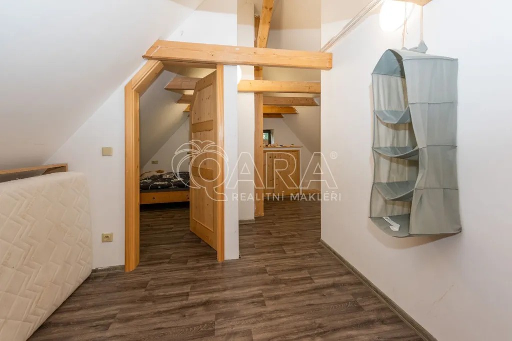 Podkroví: dva útulné pokoje, z nichž jeden se pyšní velkými průhledy do okolního prostranství, které krásně propojují domov s přírodou.