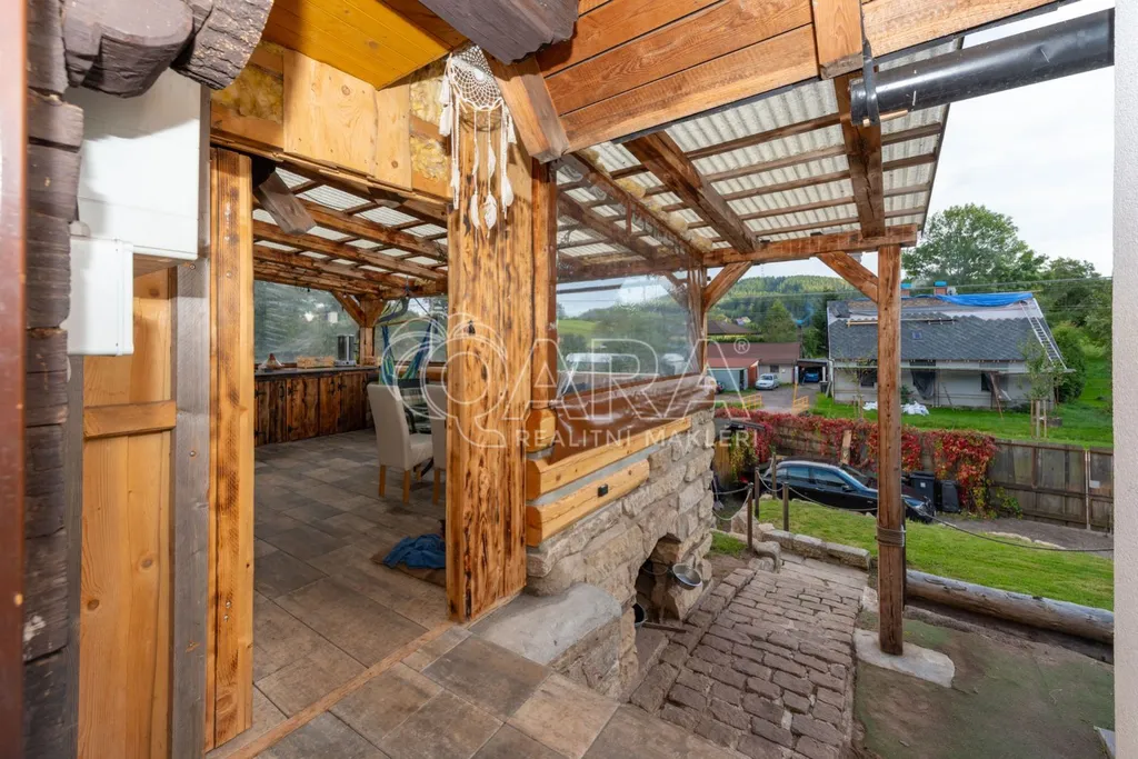 Dům je zděný, částečně roubený a nabízí dispozici 4+kk: