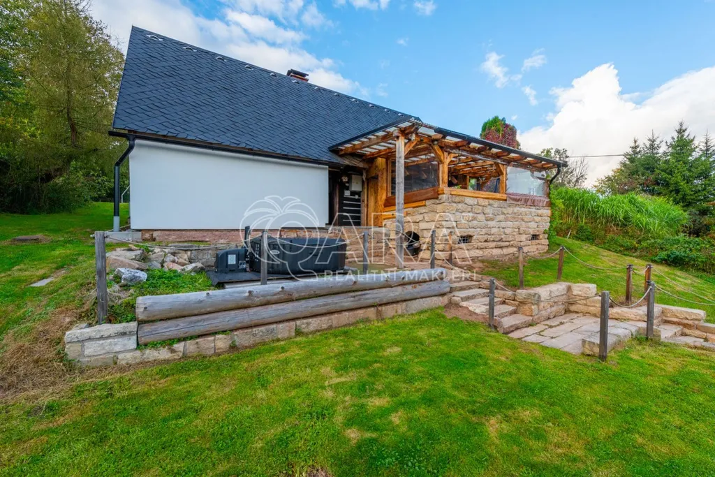 Velkou přidanou hodnotou je prostorná terasa ze štípaného pískovce a masivního dřeva, ideální pro posezení v létě i v zimě. Dominantou domu je pískovcové schodiště před domem a kaskádovitě upravený pozemek, který dodává celé nemovitosti jedinečný charakter.