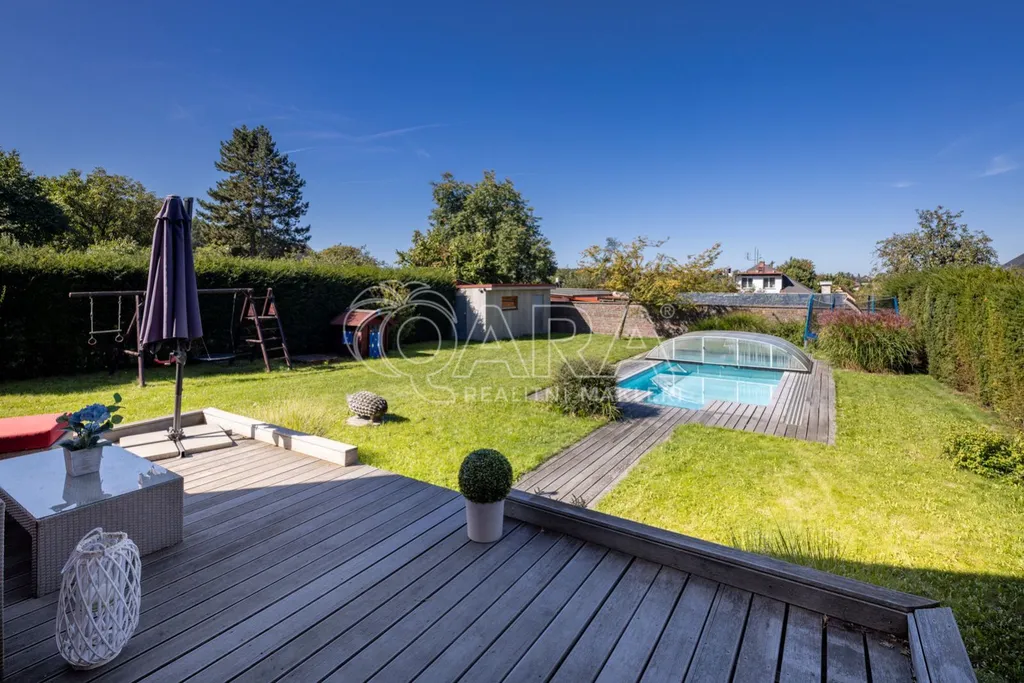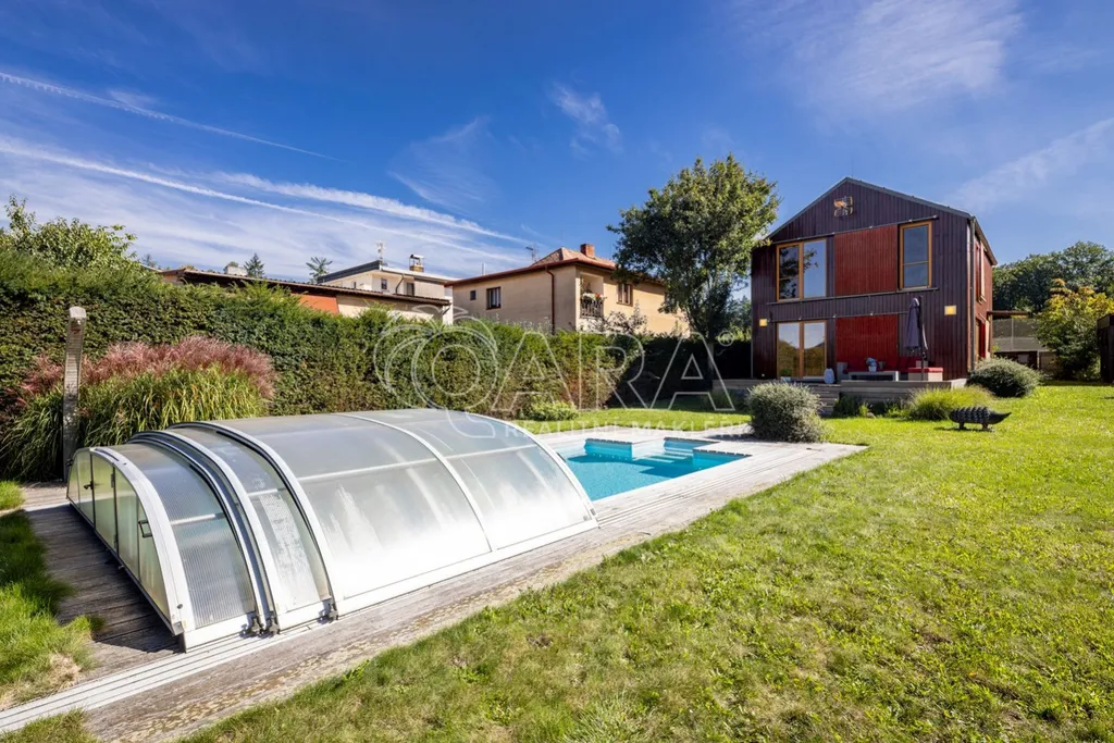 Těšit se můžete na zastřešený (Alukov) venkovní bazén Desjoyaux s protiproudem (9 x 4 m), na venkovní sprchu, kryté osvětlené parkovací stání pro 2 auta, terasu z teakového dřeva s ratanovým nábytkem, na automatickou vjezdovou bránu, udržovanou zahradu se závlahou Hunter nebo praktický zahradní domek a dětský kout.