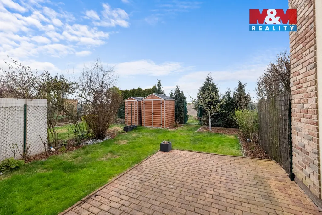 Dominantou domu je světlý obývací prostor s kuchyní a přímým vstupem na zahradu s ovocnými stromy, ideální pro relaxaci i rodinné chvíle.