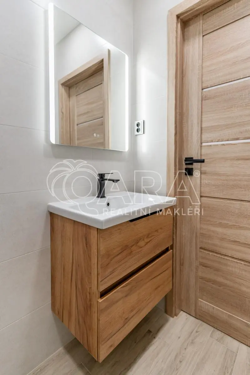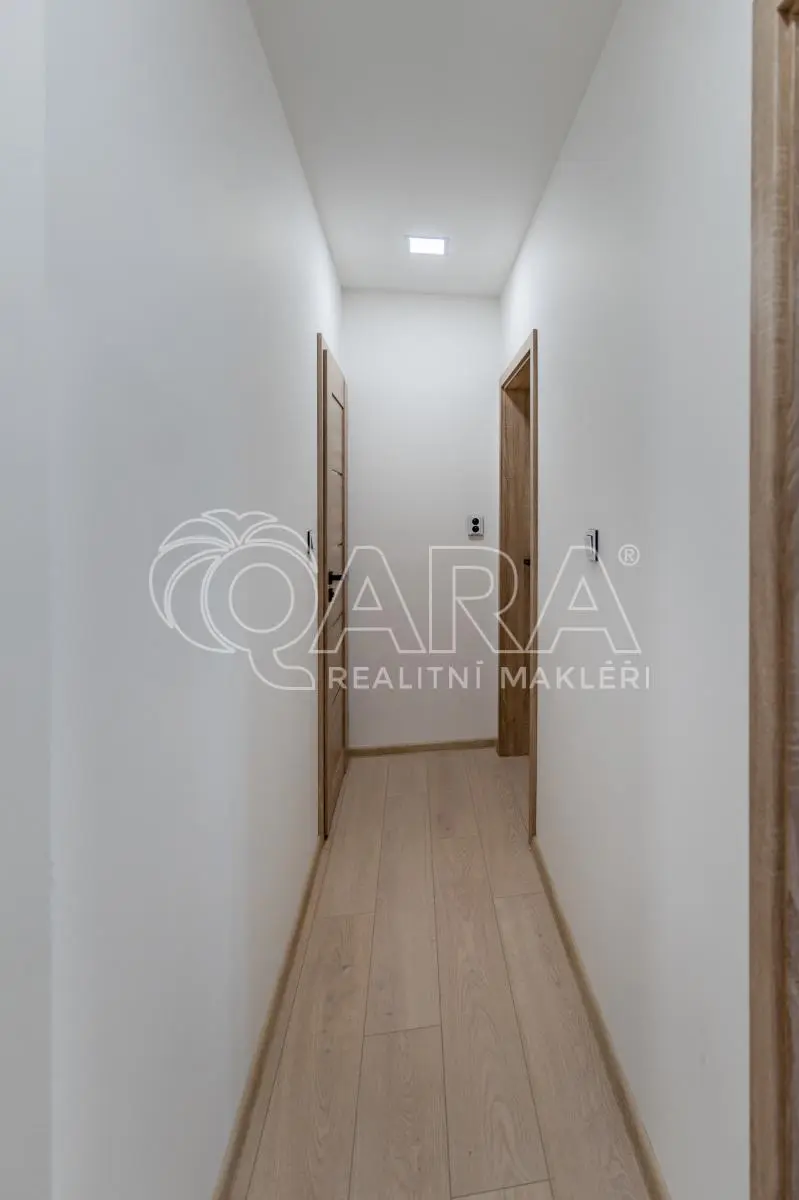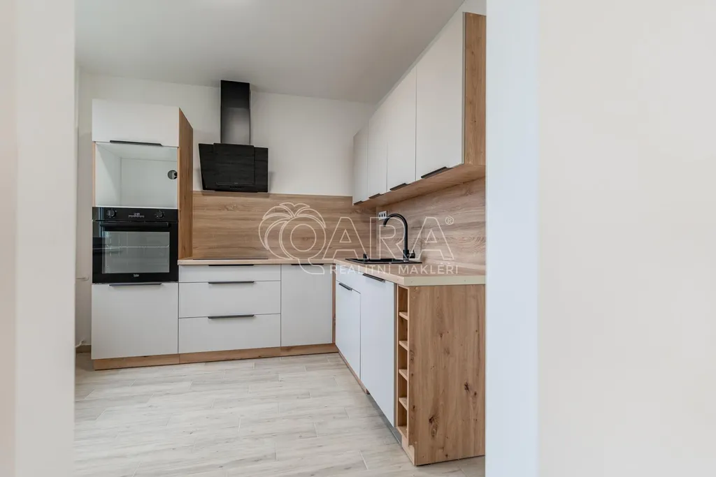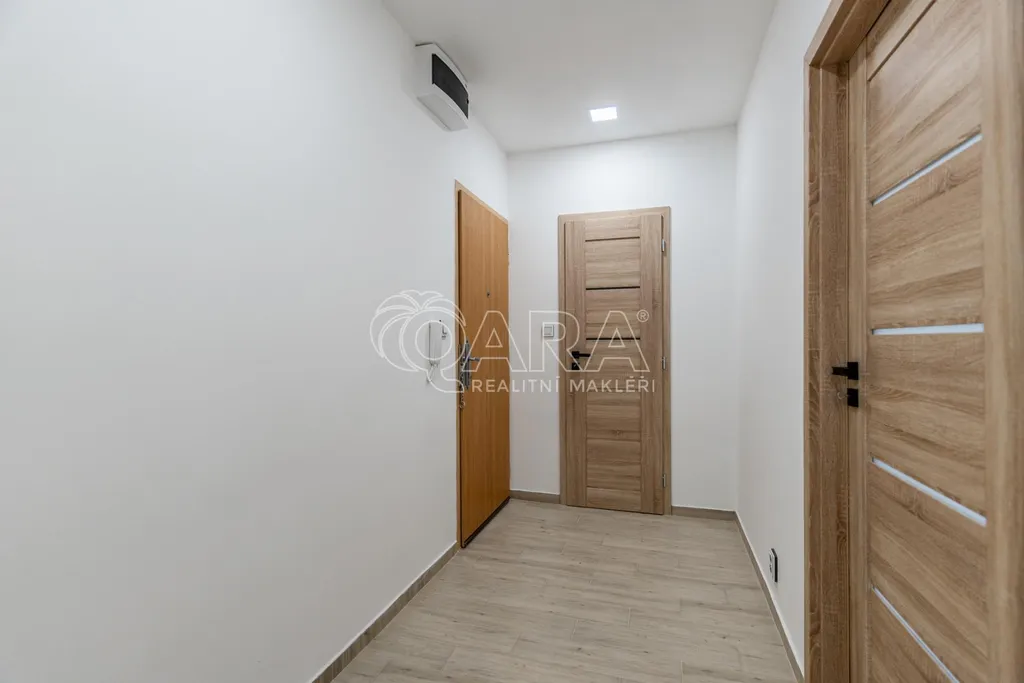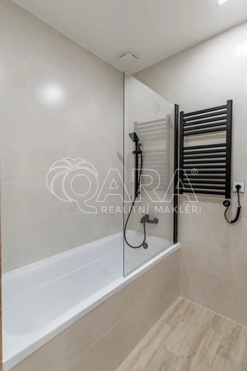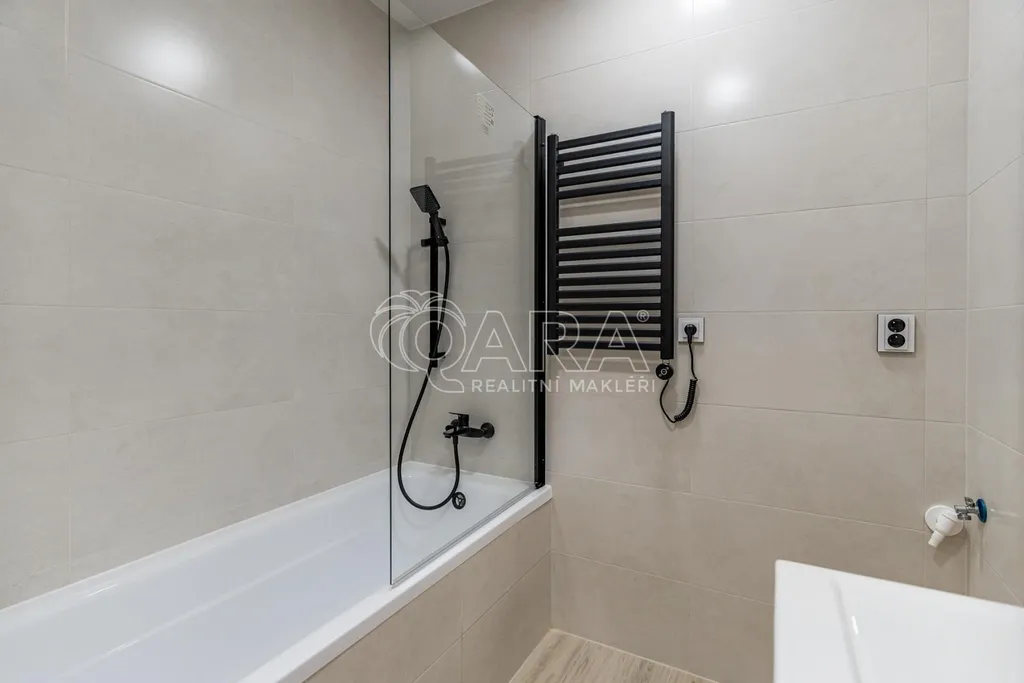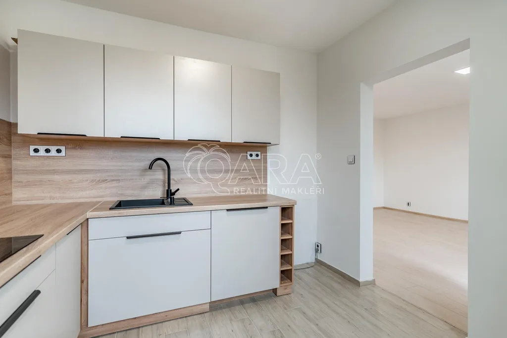 Dispozice bytu je chytře řešená, s vanou v koupelně a dostatečným prostorem pro pračku. Součástí bytu je nová kuchyňská linka, navržená pro každodenní provoz, vybavená indukční varnou deskou, vestavnou troubou a myčkou s prostorem pro lednici. Celé řešení je praktické, s dostatkem pracovních i úložných ploch, aby kuchyně přirozeně fungovala jako centrum domácnosti.