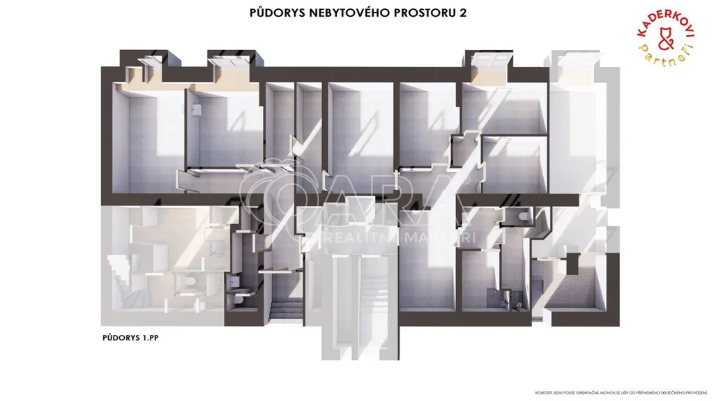Hlavní části prvního prostoru se nacházejí v 1.NP, směrem do ulice je prosklená výloha, kde si můžete umístit reklamu Vaší značky. Součástí první jednotky jsou i další místnosti umístěné v 1. PP, přístupné schodištěm, které nyní slouží převážně jako zázemí pro zaměstnance. Druhá nebytová jednotka je umístěna v 1.PP.