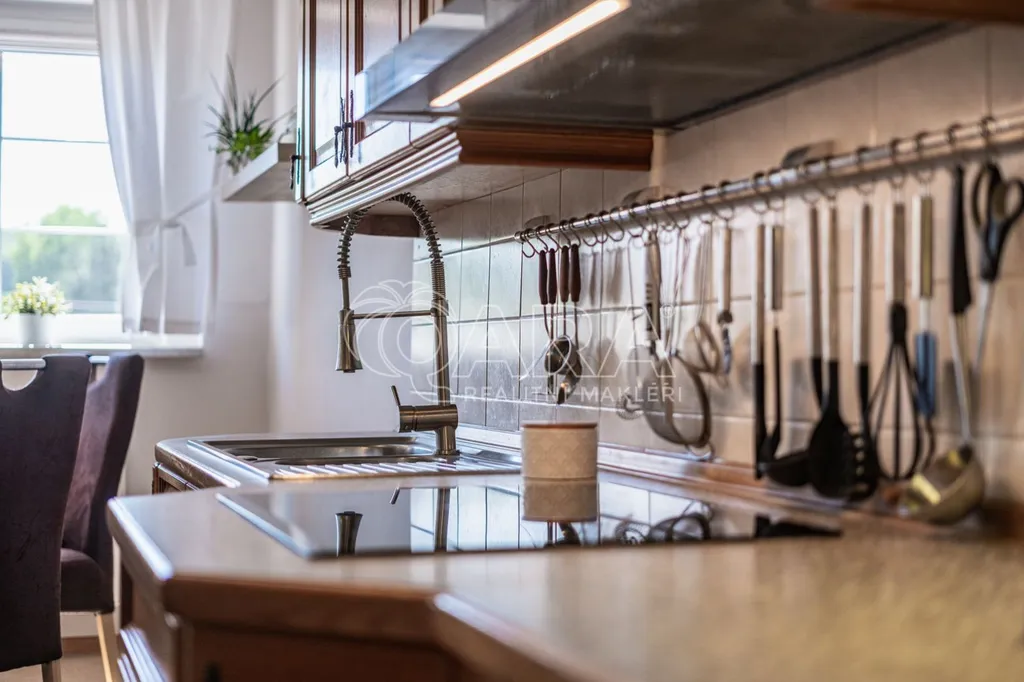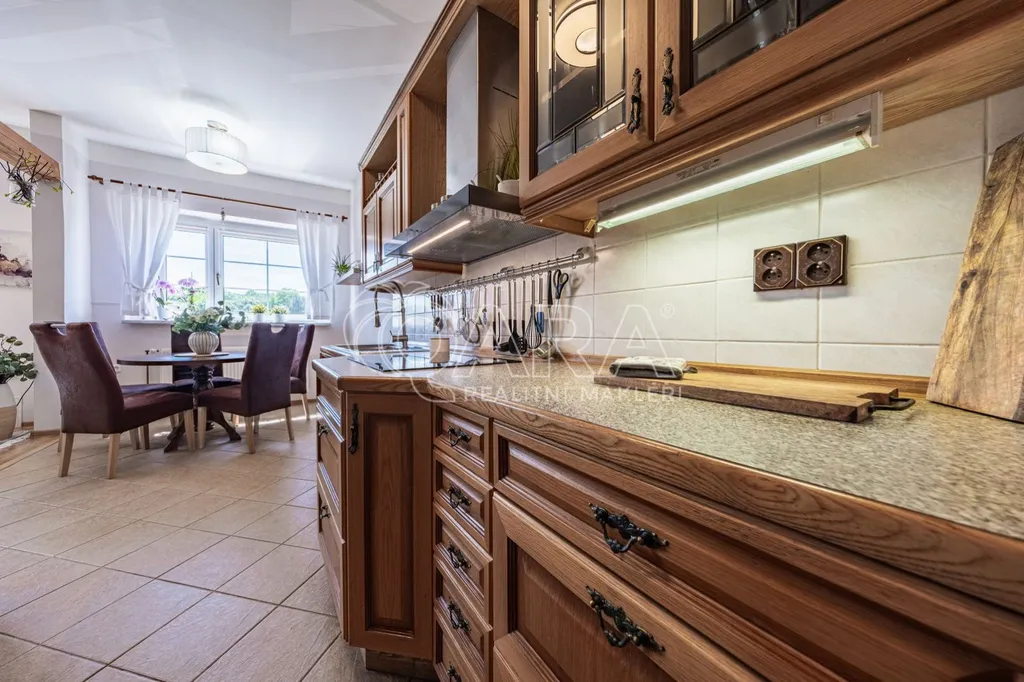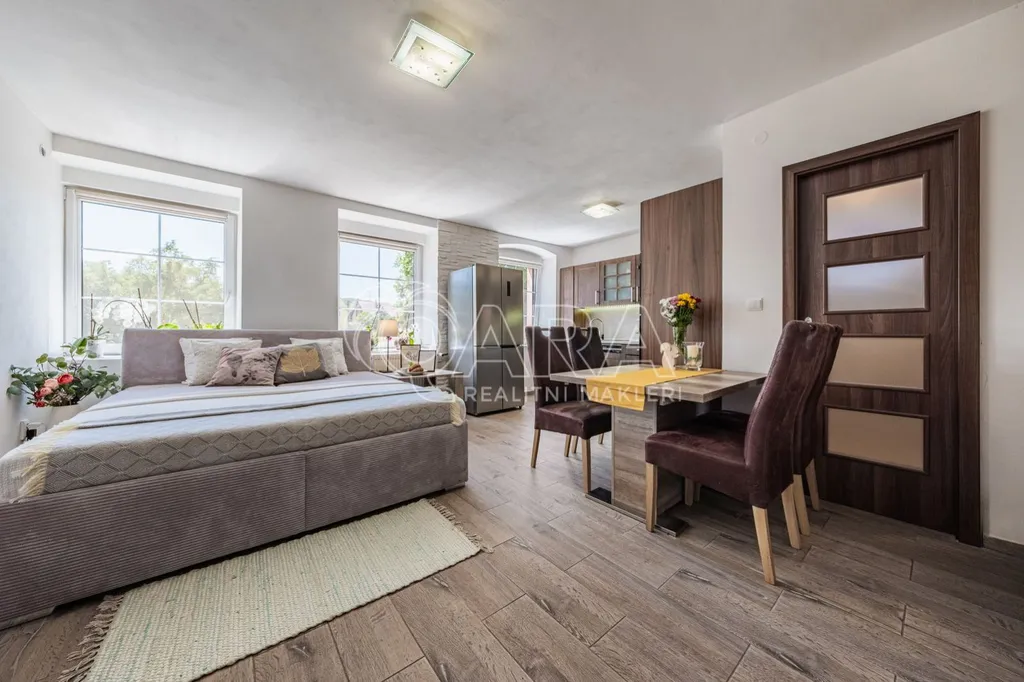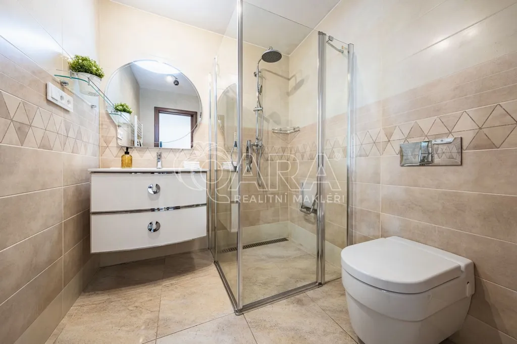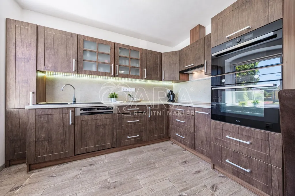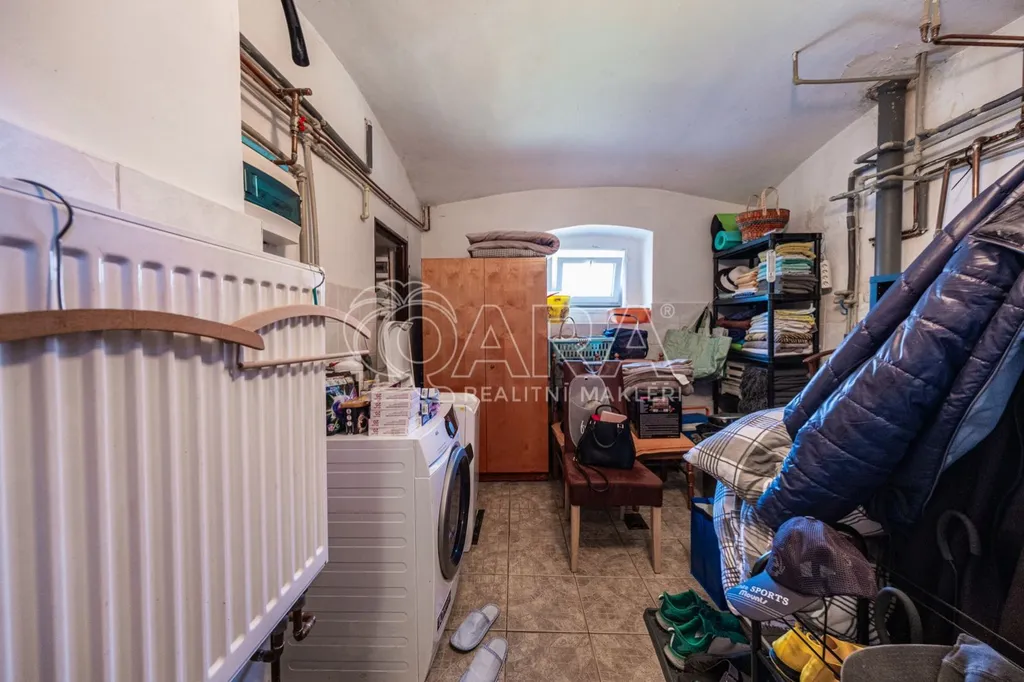 Do domu se vchází bývalým průjezdem, ze kterého je nyní uděláno prostorné garážové stání, takže pěkně suchou nožkou z domu do auta. Vjezd je opatřen novými elektrickými garážovými vraty se samostatným vstupem "pro pěší". Je zde umístěný Wallbox - nabíjecí stanice pro dvě elektroauta. Z průjezdu se vchází do přízemí domu nebo rovnou na zahradu. V přízemí je situován samostatný byt 1+kk, který je možno využít jako kancelář či máte-li odrostlejšího potomka a chce se cítit tak trochu samostatně, i zde je tato možnost, nebo pronájem. Byt je vybaven plně funkční kuchyňskou linkou, velkou a pohodlnou manželskou postelí s nočními stolky, komodou a TV, jídelním stolem a velkorysou šatní skříní na míru, prostornou koupelnou se sprchovým koutem a toaletou.