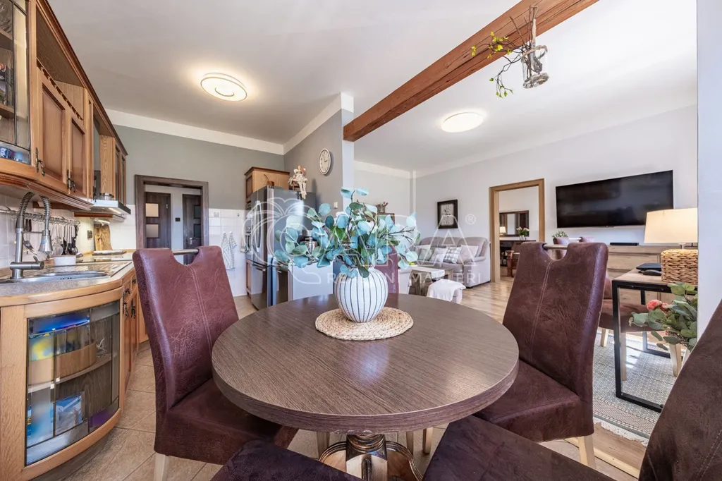 Dominantou horního podlaží je prostorný a světlý obývací pokoj decentně sladěný a propojený s kuchyní, také plně funkční, jídelním koutem a pracovním prostorem. Na obývací pokoj navazuje útulná vybavená ložnice, a další ložnice, která je nyní využívána jako šatna, tělocvična a pracovna paní domu.