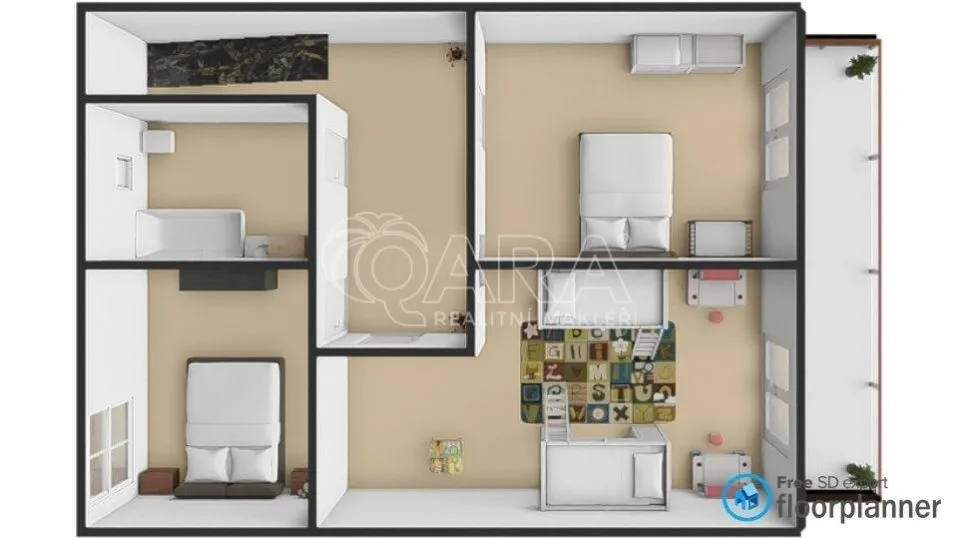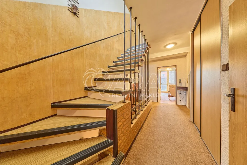 Ve druhém patře se nachází tři prostorné pokoje, z nichž dva jsou propojené balkonem, což poskytuje příjemné výhledy a možnost relaxace na čerstvém vzduchu. Obývací pokoj je propojen s terasou o výměře 21 m, ze které se dostanete přímo na zahradu. Tato zahrada je vynikajícím místem pro rodinné oslavy či odpočinek a nabízí prostor pro pěstování rostlin nebo zahradničení.
