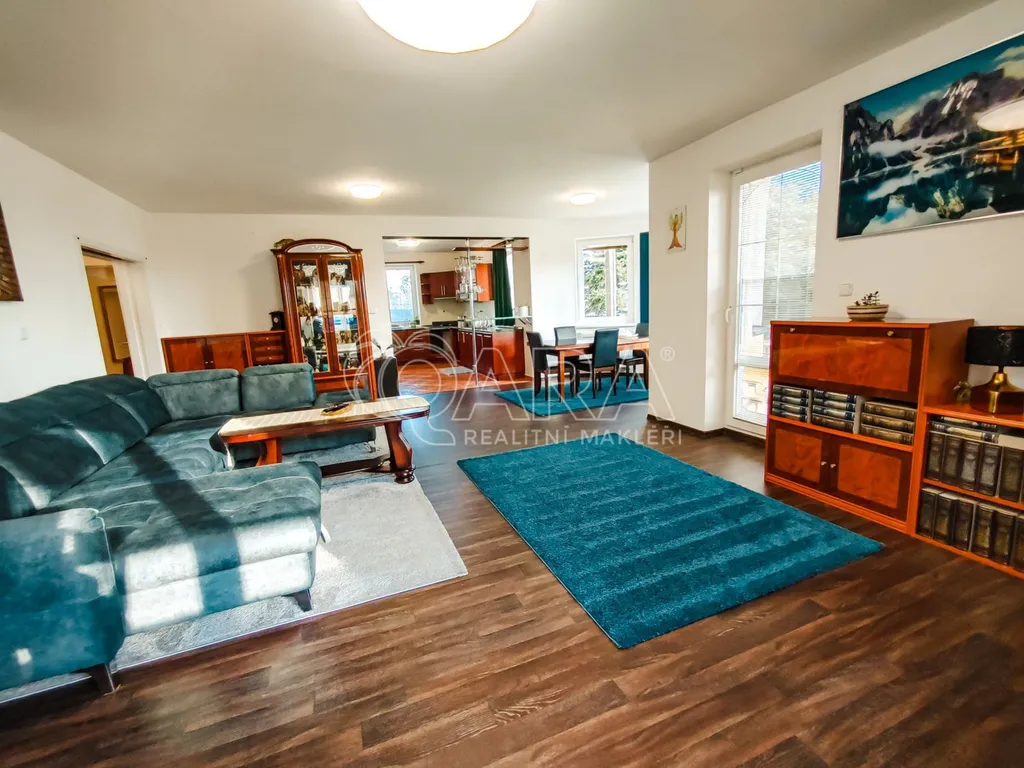 Dále je zde koupelna s vanou, bidetem a toaletou, velká šatna a především obývací pokoj s krbem, propojený s moderní kuchyní a jídelním koutem. Kuchyně je plně vybavena vestavnými spotřebiči, navazuje na ni praktická spižírna a půlkruhový výklenek ideální pro rodinný jídelní stůl.
