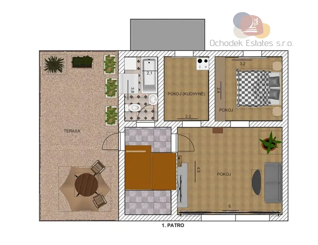 V prvním patře velký otevřený obývací prostor se vstupem do ložnice a druhého pokoje, kde je příprava sítí pro vybudování kuchyně, koupelna s WC, a hlavně vstup na velkou terasu, která výrazně rozšiřuje obytný prostor
