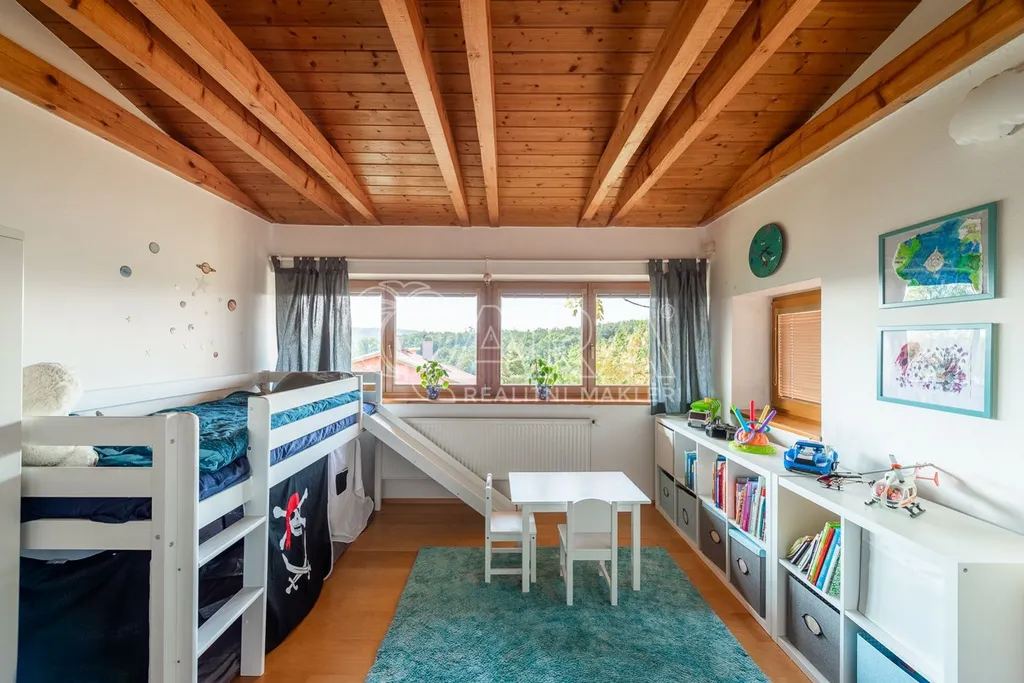 Dvoupodlažní dům 5+kk s garáží je charakteristický použitím přírodních materiálů a propojením se zahradou, která nabízí žádané soukromí. Důležitou součástí domu je rozlehlá terasa navazující na téměř všechny místnosti ve druhém podlaží. Díky krásnému výhledu na údolí je ještě umocněno všudypřítomné spojení s přírodou.
