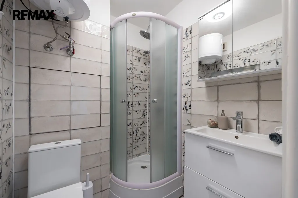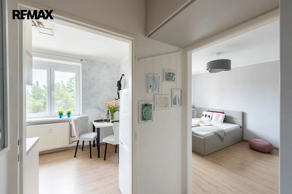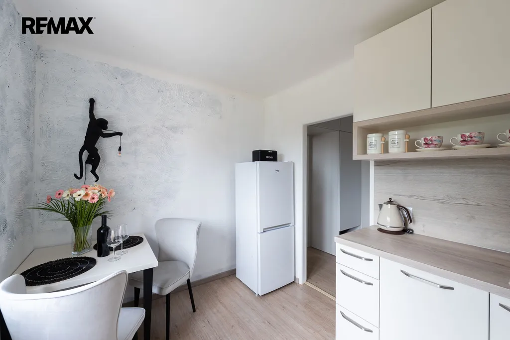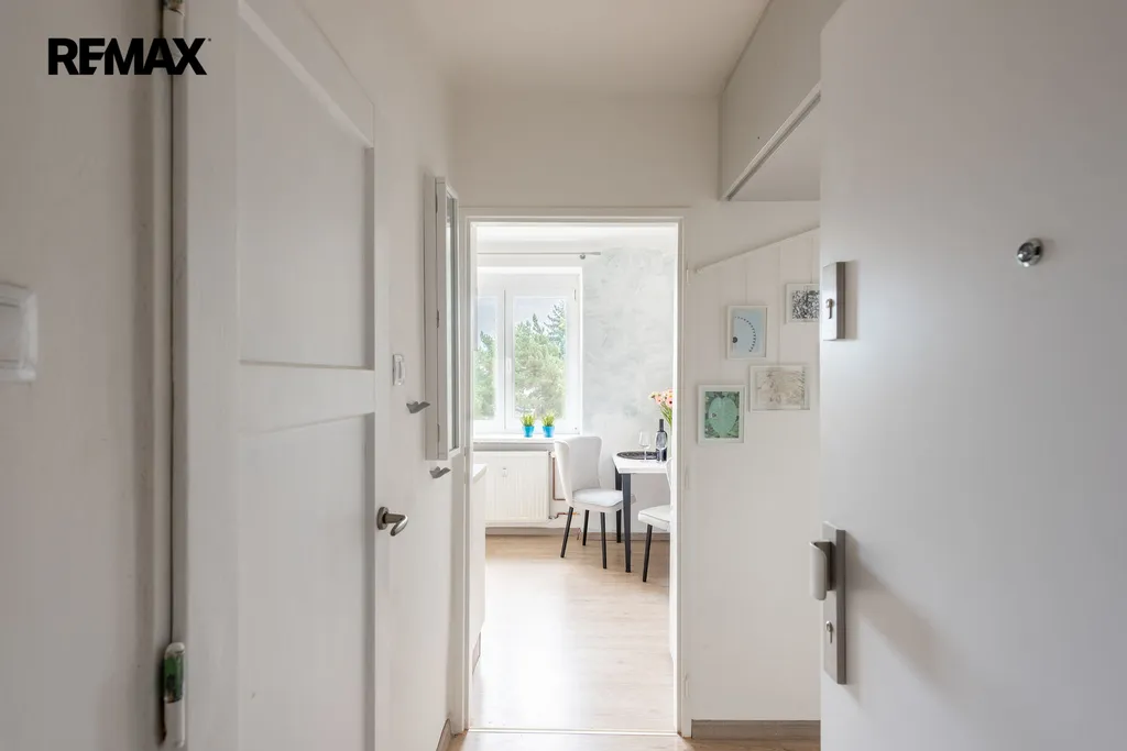 Nabízený byt má dispozici 1+1 (32 m2) a prošel kompletní rekonstrukcí. Nabízí se částečně vybaven - kuchyňská linka s vestavnými spotřebiči (trouba, indukční varná deska, myčka, pračka se sušičkou), vestavná úložná skříň v chodbě a velká šatní skříň v ložnici. Navíc k bytu náleží praktická prostorná komora přímo na patře, takže místa pro uložení věcí je tu opravdu dost. V suterénu domu je možné využívat uzamykatelnou kolárnu/kočárkárnu.